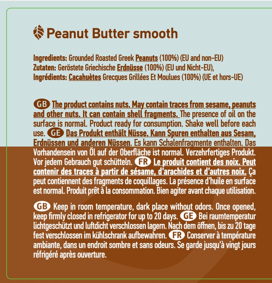 orkæl dig selv med et cremet og naturligt jordnøddesmør fremstillet af 100 % ristede græske jordnødder. Den bløde og silkeglade konsistens gør Peanut Butter Smooth perfekt til morgenmad, smoothies, pandekager, snacks, desserter eller som et sundere alternativ til traditionelle spreads.